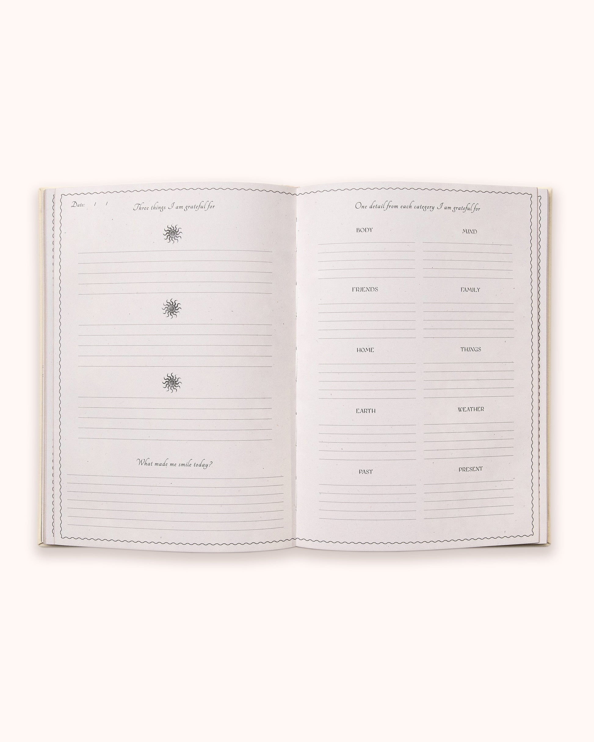 This journal was created to help you cultivate a mindset of gratitude, to gently shift your focus towards appreciation. For when you express gratitude for the countless blessings in your life, big or small, you attract even more experiences, things or people to be grateful for.